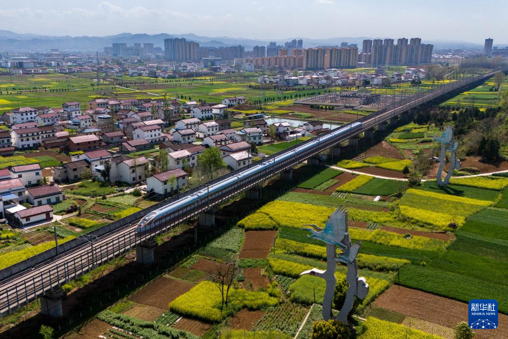 高鐵列車駛過洋縣洋州街道何家村附近的朱鹮雕塑(3月31日攝,無人機照片)。