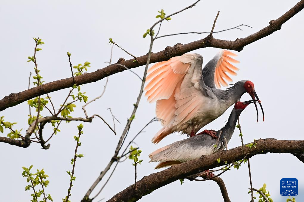 3月30日,洋縣草壩村,一對朱鹮夫婦在枝頭“踩背”。
